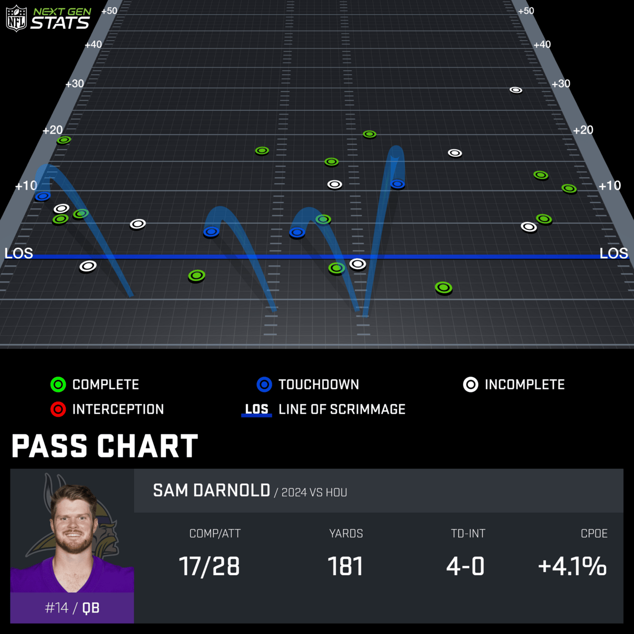 All four of Sam Darnold’s touchdowns came on short passes (between 0 and 10 air yards), against four-or-fewer rushers, and against man coverage – three came against the Texans in cover 0. Darnold was also effective when he holds in the pocket, completing 10 of 19 passes for 132 yards and 3 TD on dropbacks over 2.5 seconds.