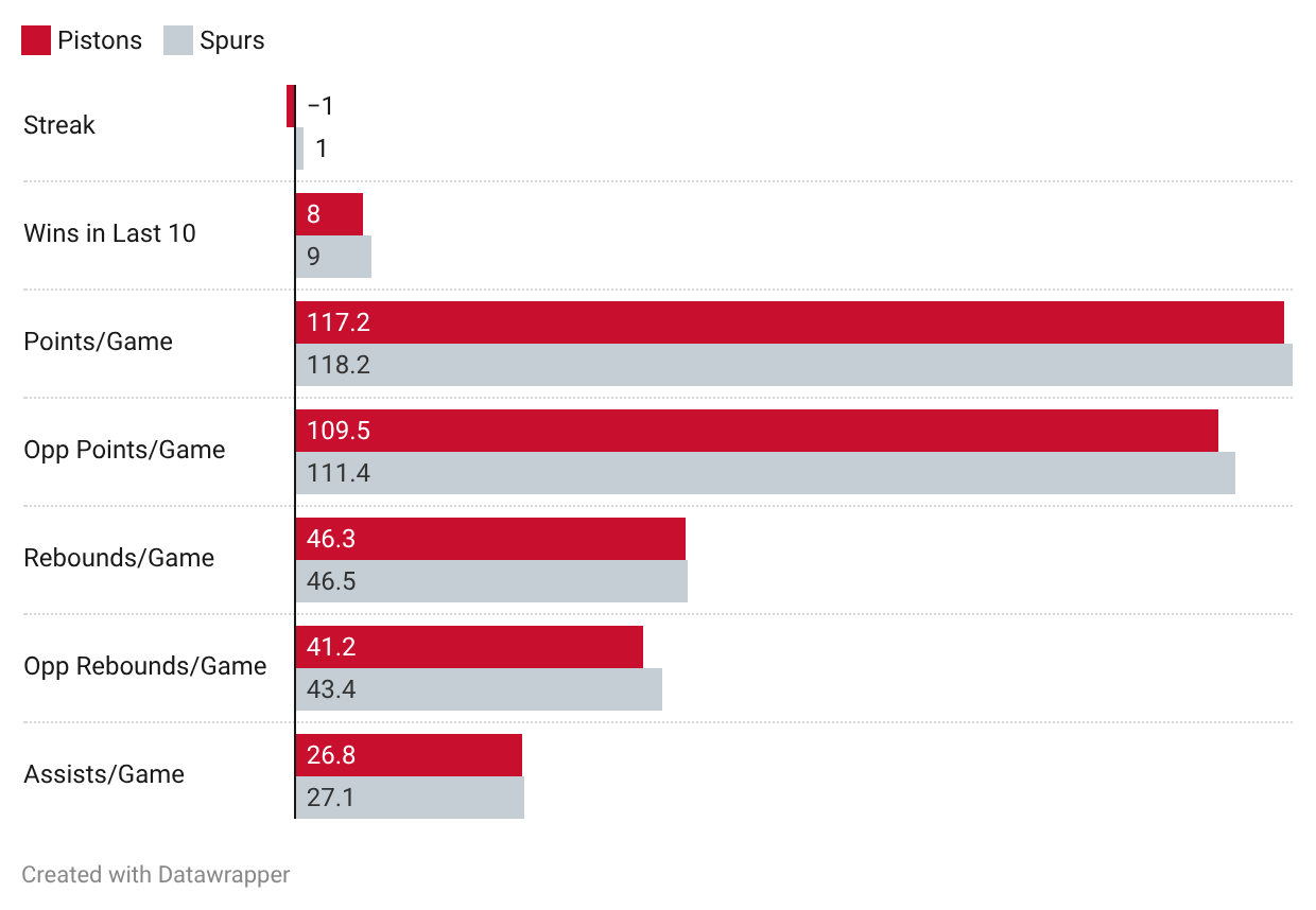 Pistons (45-15, 21-8 Away) vs. Spurs (44-17, 21-6 Home)